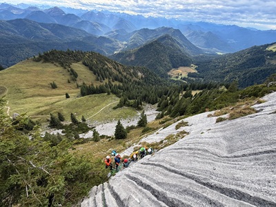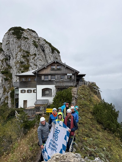 Am Freitag und Samstag verliefen die Ausbildungsinhalte planmäßig – das Wetter zeigte sich von seiner besten Seite. In der Nacht auf Sonntag änderte sich die Lage jedoch schlagartig: Ein aufziehender Sturm brachte starke Böen,und eine davon setzte dem Fahnenmast der Hütte zu. Das Holz brach,und der Mast stürzte samt Fahne der Tegernseer Brauerei über die Südwand und blieb rund 30 Meter tiefer auf einem Grasband liegen.