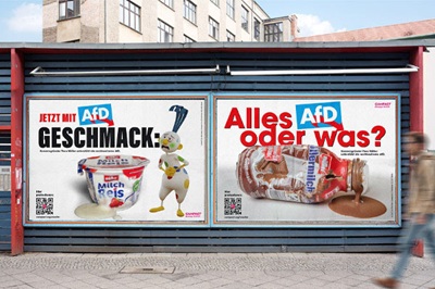Wir lassen uns nicht entmutigen. Im Gegenteil,wir setzen sogar noch eins drauf um zu zeigen: Wenn Theo Müller sich nicht von der AfD distanziert,wird der Protest immer lauter. Bislang schweigt der Milch-Milliardär. Eine ramponierte Flasche Müllermilch mit der Aufschrift „Jetzt mit AfD-Geschmack“ – mit diesem Plakatmotiv machen wir Müllers AfD-Nähe zum Thema – deutschlandweit.