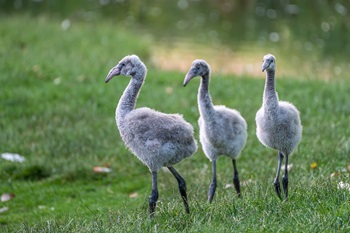 Bei den Flamingos in der Wilhelma haben die ersten Jungvögel des Jahres ihre Nester verlassen. Drei graue Federknäuel auf langen Beinen staksen zusammen mit den in ein zartes Rosa gehüllten Altvögeln durch das flache Wasser der Flamingo-Anlage. Auf den ersten Blick könnte man meinen,dass es sich bei der Dreier-Truppe um Geschwister handelt.