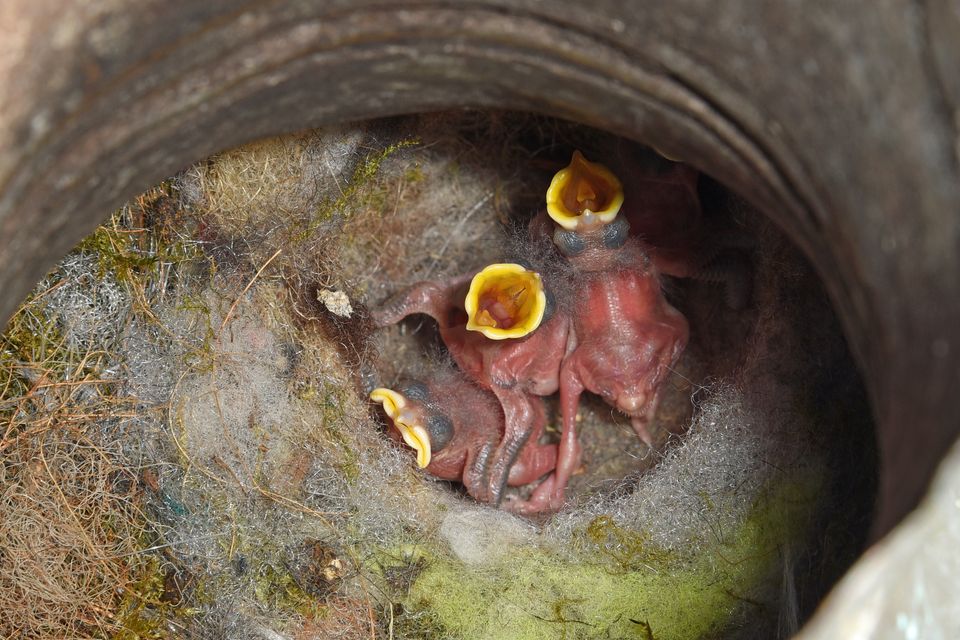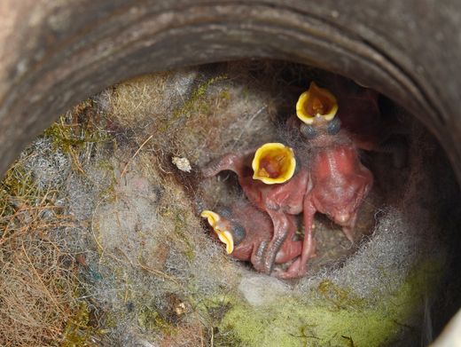 Drei frisch geschlüpfte Kohlmeisen sperren in ihrem Nest die Schnäbel auf