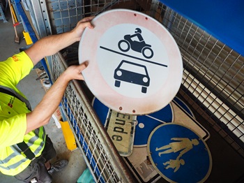 Foto (Stadt Uhingen): Uhingens Bauhof sammelt ausgediente Schilder,die etwa von der Sonne verblichen sind,und stellt sie für eine Wiederaufbereitung zur Verfügung.