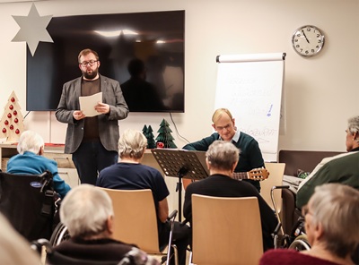 Dabei sang Oberbürgermeister Alex Maier und Imgart begleitete auf seiner Gitarre. So erklangen in der Pflegeeinrichtung Karlshof,im Christophsheim am Park,im Haus Vinzenz (Bild) sowie im ASB-Seniorenheim besinnliche Weihnachtslieder. Alle Beteiligten hatten viel Freude am gemeinsamen Singen und waren mit Begeisterung dabei.