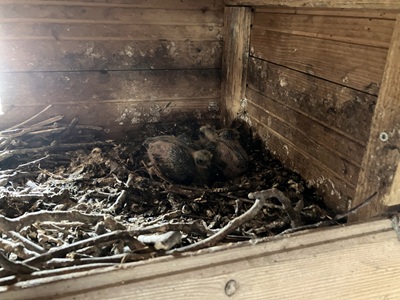 Fotos (E. Herrmann): Fünf Kästen auf der Südseite der Mühle; Zwei Dohlenküken