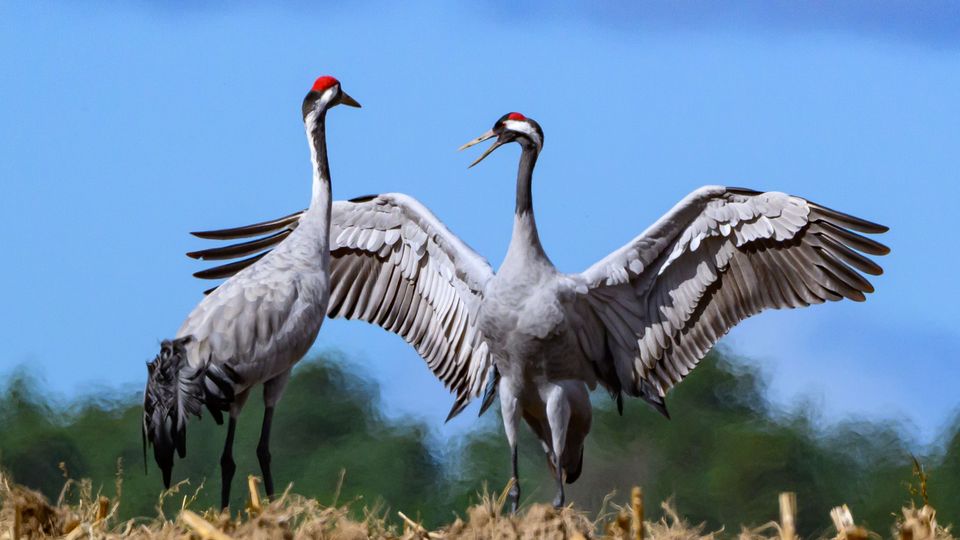 Zwei Kraniche auf einem abgeernteten Maisfeld in Brandenburg
