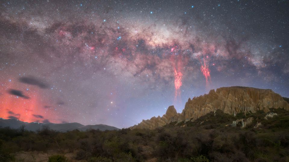 In der Nacht zum 12. Oktober 2025 gelangen einem Fotografentrio auf der Südinsel Neuseelands außergewöhnliche Aufnahmen: Über den berühmten Clay Cliffs leuchteten sogenannte »Rote Kobolde«,eines der weltweit seltensten Lichtphänomene. Die rötlichen Blitze – auch »Red Sprites« genannt – erstrahlten hoch über einem Gewitter,direkt neben der funkelnden Milchstraße am Himmel.