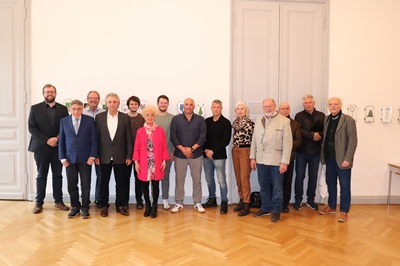 Foto (Stadt Göppingen): Freude über das jährliche Treffen mit den Schönhengstern in Göppingen. Mit dabei Oberbürgermeister Alex Maier sowie Dr. Wolfgang Fritscher,Vorsitzender des Stiftungsrats,Friedrich Eigel,Landschaftsbetreuer für den Schönhengstgau,weitere Mitglieder und Vertreter aus dem Gemeinderat.