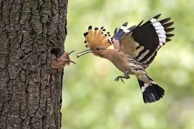 Foto (NABU/Thomas Hinsche): Wiedehopf füttert Jungtier in Baumhöhle auf Streuobstwiese