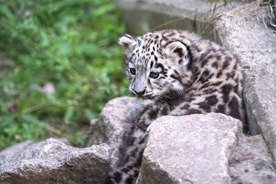 Foto (© Wilhelma Stuttgart/Birger Meierjohann): Bereits am 20. April kam in der Wilhelma der junge Schneeleopard zur Welt. Mittlerweile zeigt er sich immer häufiger.